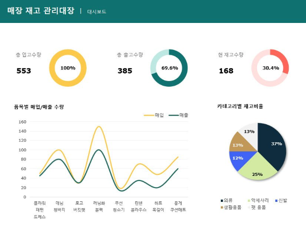 입출고 내역을 기록하면 대시보드가 자동 생성되며, 품목별/카테고리별 재고 현황 확인이 가능합니다.