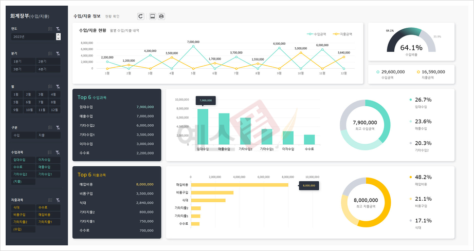 회계장부(수입/지출)입니다. 사업장에서 발생하는 수입/지출 내역에 대한 발생일자, 계정과목, 수입/지출 금액 등의 간단한 정보를 피벗테이블과 슬라이서 기능을 활용하여 연도별, 분기별, 월