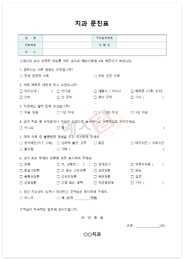 예스폼 치과문진표는 치과에서 환자의 정확한 진료를 위해서 작성하는 문진 양식입니다. 고객의 정보와 문진 사항 등 세부적인 내용으로 구성되었기 때문에 치과에서 활용해 볼 수 있는 서식인데요. 여름철 악화되기 위한 치아 건강을 위해서는 주기적인 구강 검진이 필수입니다. 때문에 여름철에 치아 건강이 우려되거나, 치아 건강에 문제가 생겨 치과를 찾으시는 분들이 많으실 텐데요. 예스폼 치과 문진표는 이렇게 치과를 찾는 환자분들의 편의성을 위해 제작되었습니다.