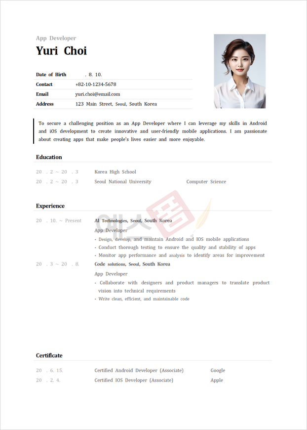 구직자가 해외 기업에 자신의 경력과 능력을 명확하고 간결하게 어필하고, 지원하는 직무에 적합한 인재임을 강조할 수 있는 영문 이력서 양식입니다. 개인 정보, 직업 목표, 학력 사항, 경력 사항, 자격증 등을 명시할 수 있습니다. AI 개발 분야에 지원하는 특정 구직자의 이력서 내용이 예시로 포함되어 있습니다.