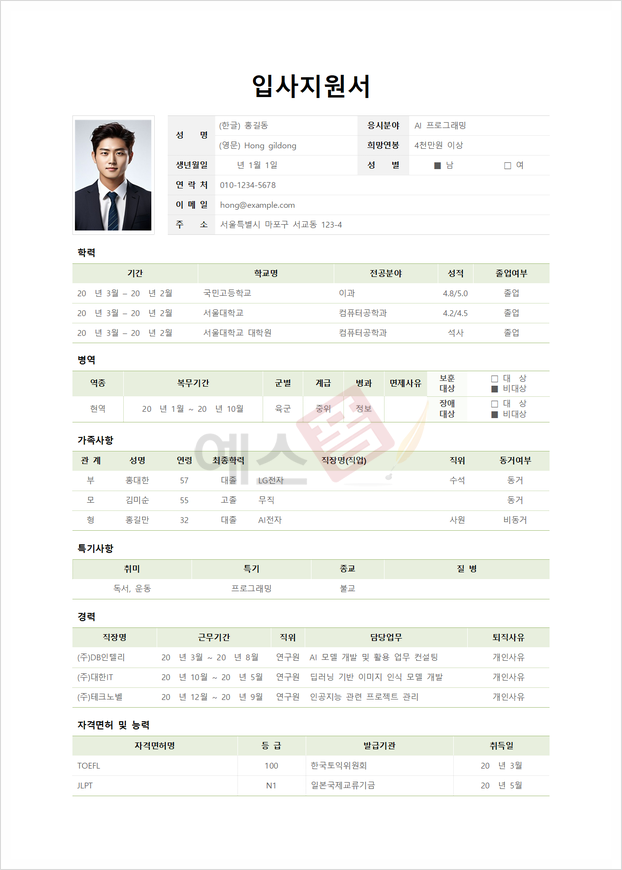 | 인적 사항 | 이름, 주소, 휴대폰, 이메일, 지원 포지션 등 기술 |