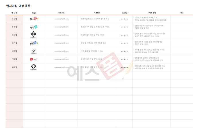 조직이나 기업이 자신의 업무나 프로세스를 다른 조직이나 기업의 유사한 활동과 비교하여 성과나 효율성을 개선하기 위해 사용되는 벤치마킹 보고서입니다.벤치마킹 대상 목록, 벤치마킹 내