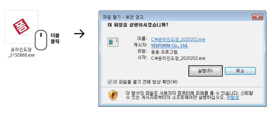 3️⃣ 보안 경고가 나올 경우 실행(R)을 눌러주시면 자동으로 압축이 해제되며 바탕화면에 [예스폼 온라인 도장] 폴더가 생성됩니다.
