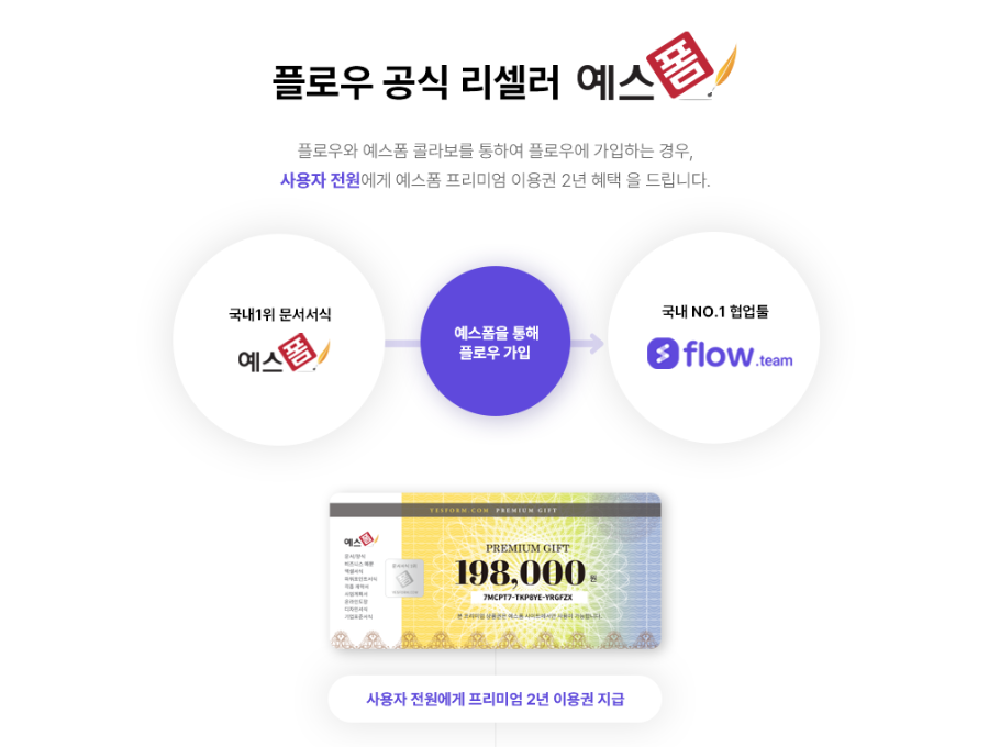예스폼을 통해 플로우에 가입하면 예스폼에서 제공하고 있는 70만 종 이상의 문서와 서식 콘텐츠를 가입일로부터 2년 동안 자유롭게 이용할 수 있는 19만 8천원 상당의 프리미엄 이용권 혜택이 제공된다.
