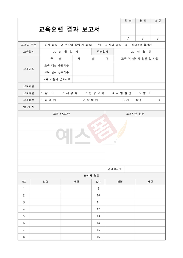 교육내용과 참석자 명단, 교육 진행자 의견 등을 기재하여 교육훈련의 결과를 보고하기 위한 양식입니다.