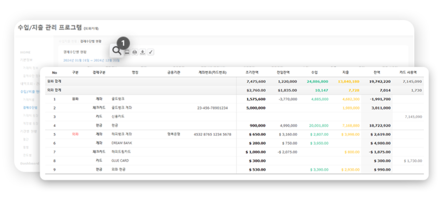 수입/지출(외화거래) 관리 Program은 원화/외화의 수입/지출, 계좌 간 이체 내역을 손쉽게 입력하고 관리할 수 있습니다. 달러, 엔화, 유로, 파운드 등 다양한 외화 거래에 대한 관리가 가능하며, 실