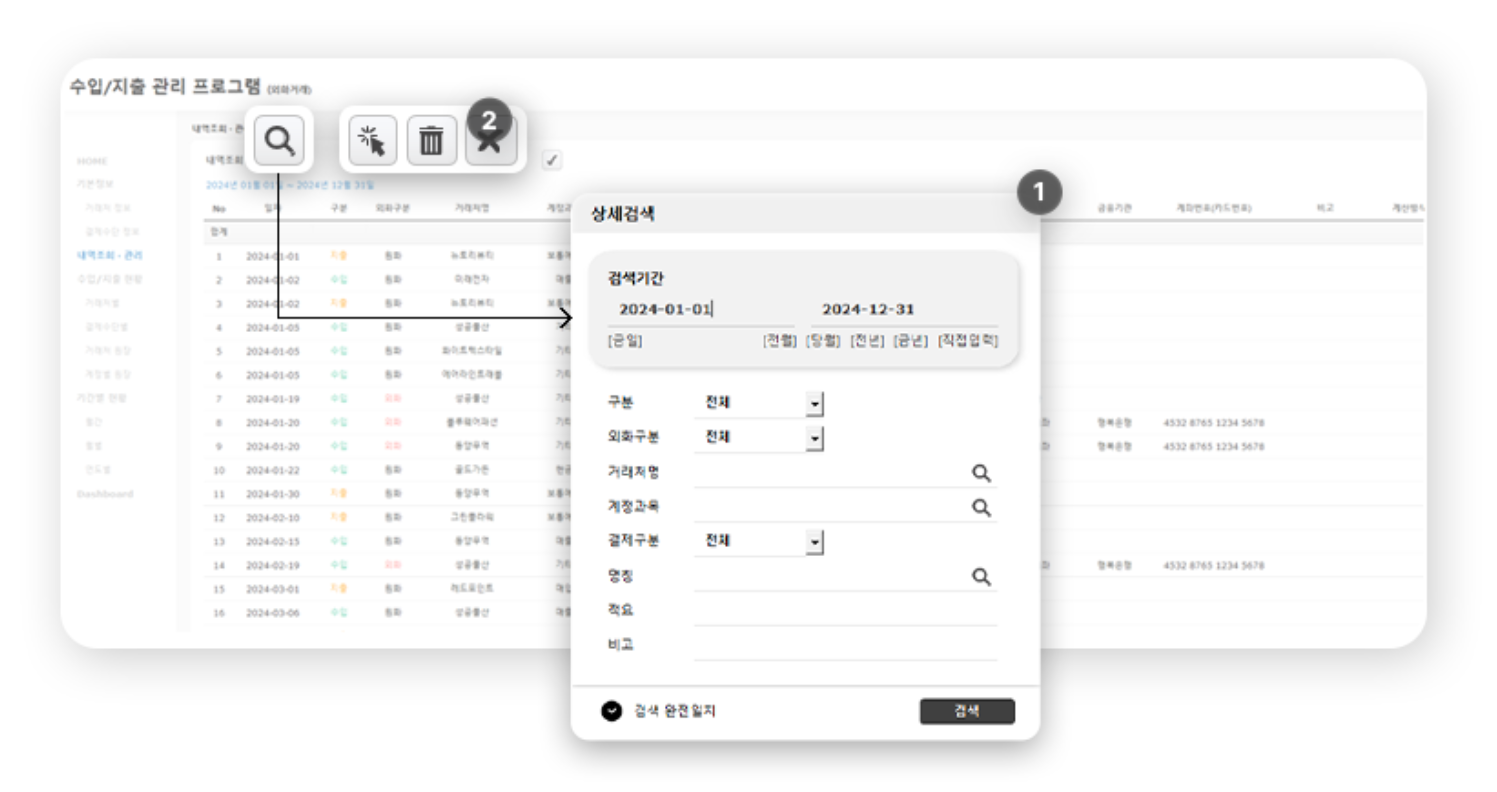 1️⃣ 버튼 클릭 시, 각종 조건을 설정하여 내역을 검색할 수 있습니다.