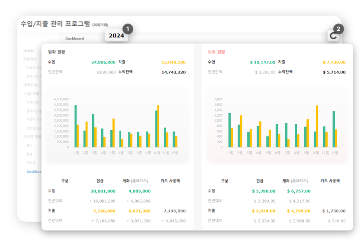연간(1월~12월) 원화/외화거래 현황 및 대시보드를 제공하는 시트입니다.