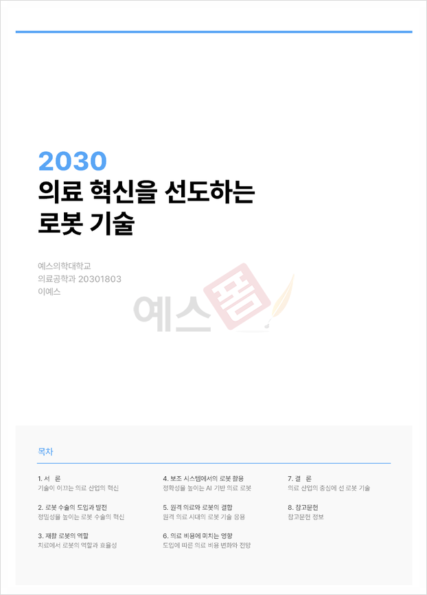 | 의료 로봇의 발전과 미래 전망 레포트 | 한국 고령화 사회에 따른 경제적 영향 | SNS 마케팅의 성공 요인 |