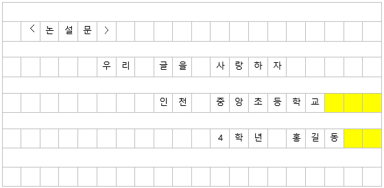 (나) 소속은 뒤쪽 세 칸을, 이름은 뒤쪽 두 칸을 비우고 쓴다. 단, 이름은 소속 다음 줄에 쓴다.