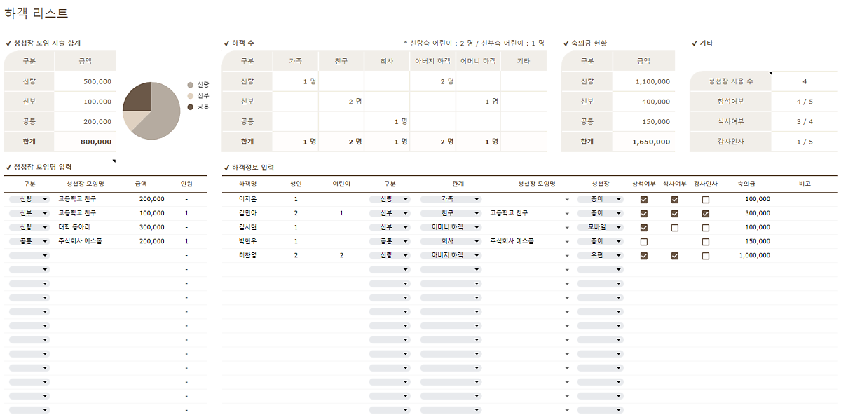 청첩장 모임 내역, 지출 금액을 함께 관리할 수 있으며 신랑/신부/공통 하객 및 가족/친구/회사별 하객을 한눈에 확인할 수 있습니다.