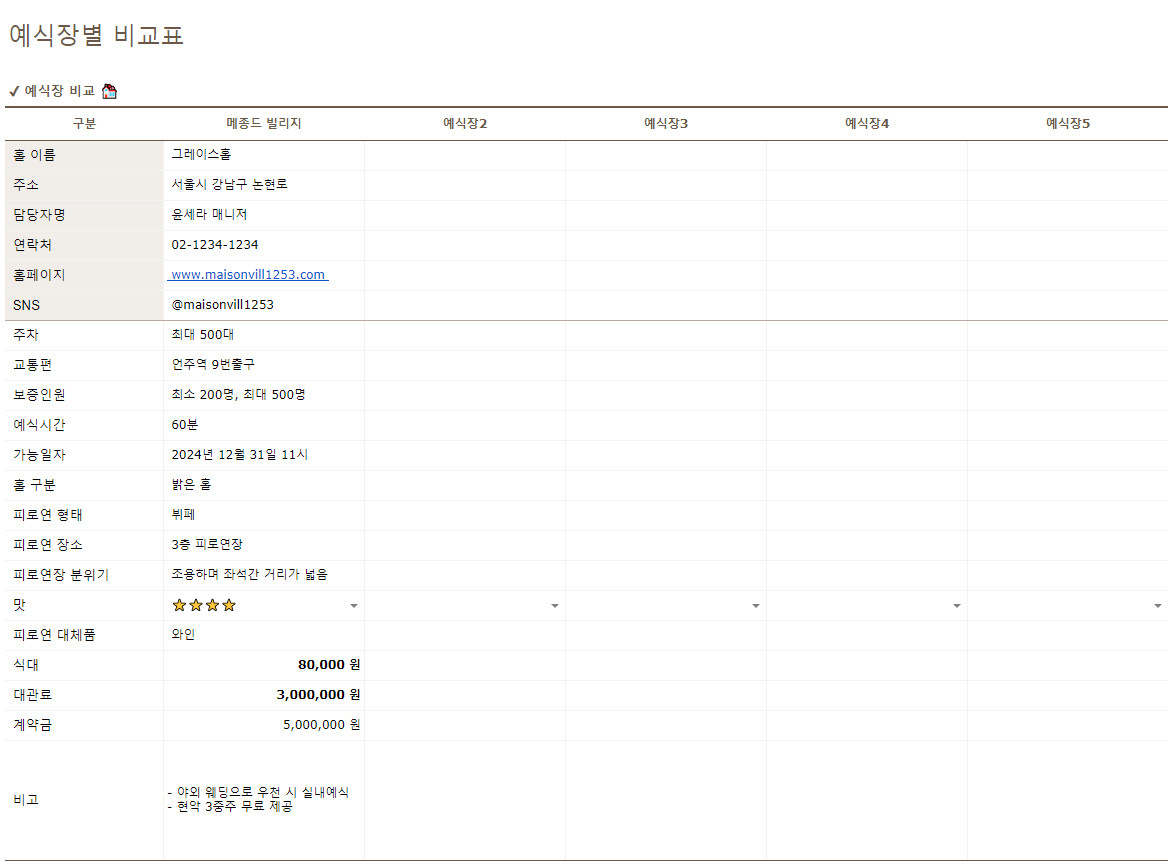 예식장별 특징을 기재하여 비교할 수 있는 예식장 비교표를 제공합니다.