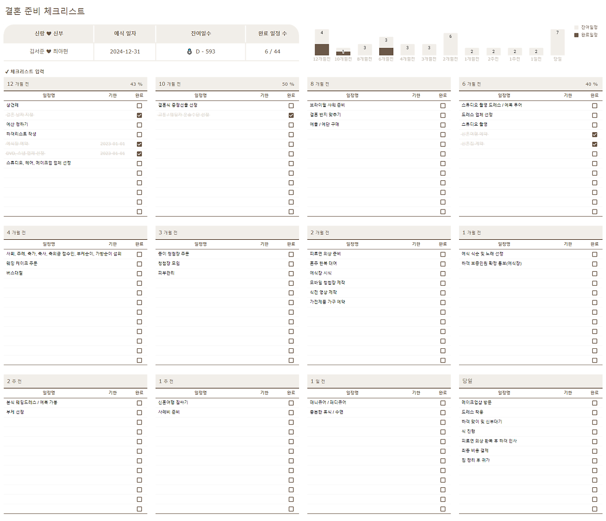 신랑, 신부명과 예식 일자를 바탕으로 결혼 잔여일수가 표시되며 전체 일정과 완료된 일정을 확인할 수 있는 결혼준비 체크리스트 시트입니다.