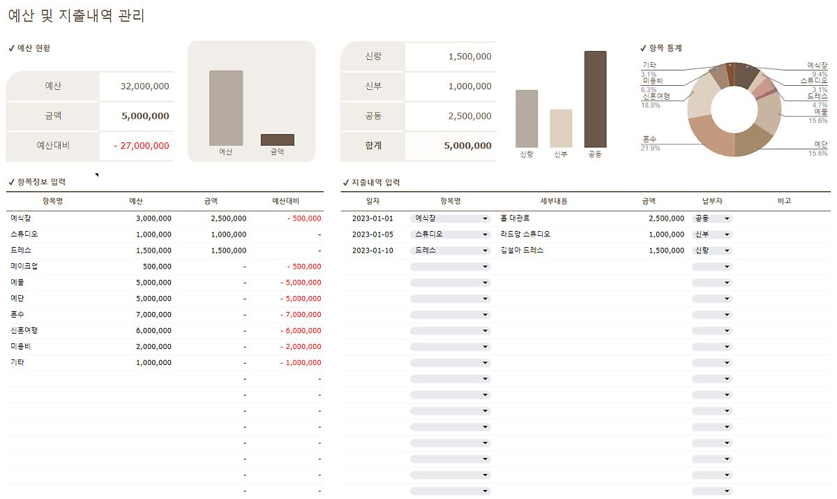 결혼 준비 시 예산, 지출내역을 항목별로 관리할 수 있으며 신랑/신부/공동 납부자별 지출 금액을 한눈에 파악할 수 있습니다.