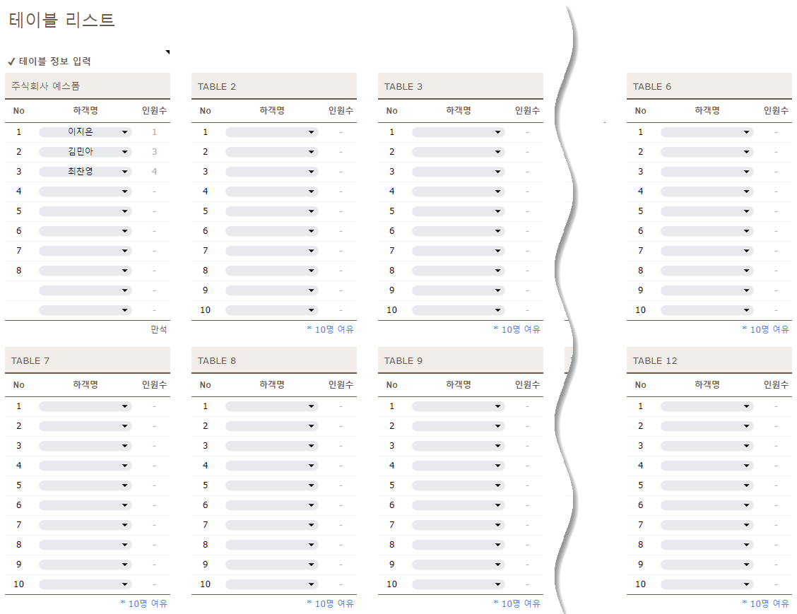 테이블별 하객 리스트를 관리할 수 있습니다. 테이블별 인원수 파악이 가능하며 하객명 선택 시 만석/여유 등 테이블 상태가 표시됩니다.