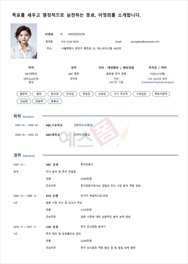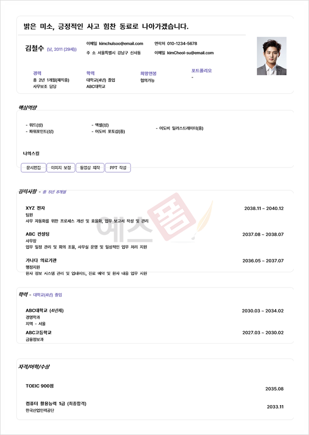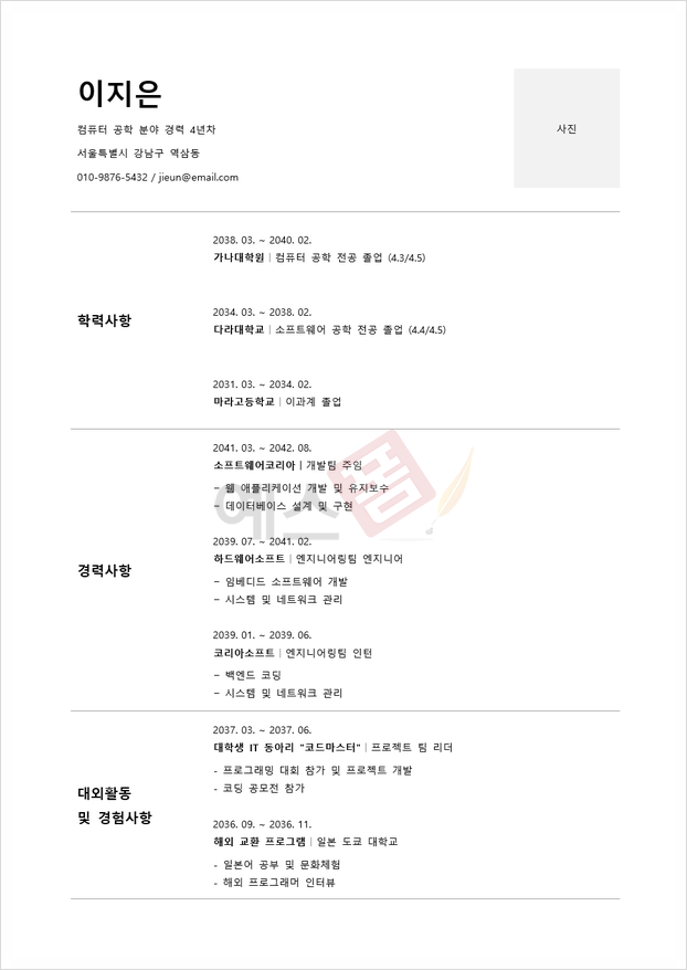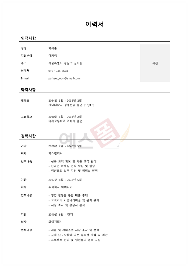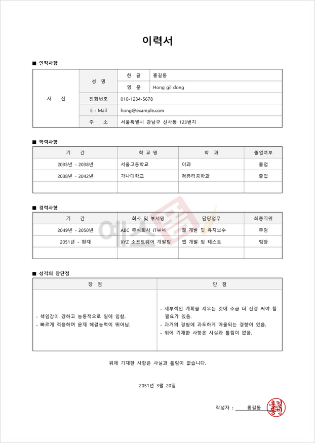 신입사원용 이력서는 경력이 부족하기 때문에 학력, 학교에서의 활동, 자원봉사 경험 등을 중점적으로 다룹니다. 중요한 것은 단순히 활동을 나열하는 것이 아니라, 해당 활동을 통해 어떤 역량을 개발했고, 어떻게 직무에 적용할 수 있는지를 보여주는 것입니다. 예를 들어, 팀 프로젝트에서의 리더십 경험, 문제 해결 능력, 시간 관리 능력 등이 그 예입니다. 또한, 신입사원용 이력서에서는 학습 의지와 성장 가능성을 강조하는 것이 중요합니다.
