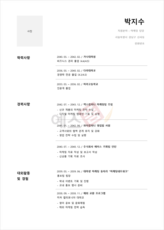 | 마케팅 전문가 | 책임감 강조 | 경력사항 |