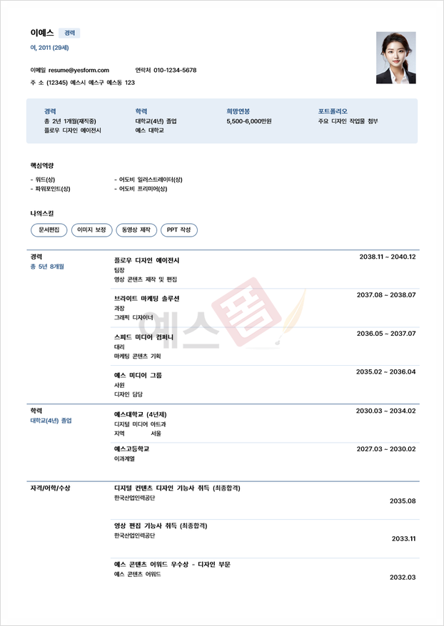 예스폼에서 제공하는 이력서 양식은 신입사원 이력서부터 경력직 이력서, 전문직 이력서 등 구직자가 속한 분야와 경력 수준에 맞게 본인의 이력서를 맞춤화할 수 있도록 제작되었는데요. 현재 취업 시장에서 선호하는 최신 트렌드를 반영한 디자인을 채택하여 다양한 포맷과 디자인으로 제공 중입니다. 각 이력서 서식에는 각 상황에 맞는 이력서 예시가 포함되어 있어 이력서 작성 과정에서 발행할 수 있는 여러분의 어려운 상황을 최소화하고 구직자 본인의 경력과 역량을 어떻게 효과적으로 배열하고 소개할 수 있는지에 대한 가이드라인을 제공합니다.