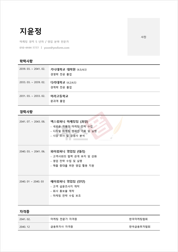 이력서 작성 과정은 본인을 성공적으로 마케팅하기 위한 기획 단계입니다. 특히 비전공자나 경력 전환자의 경우 자신의 역량과 잠재력을 전달하는 강력한 도구로 사용할 수 있는데요. 결국, 각자의 경험과 역량을 가장 잘 드러낼 수 있는 이력서를 작성하는 것이 성공적인 취업으로 가는 첫걸음임을 기억해 주시기 바랍니다. 오늘 소개드린 이력서 양식, 이력서 서식과 신입, 경력, 전문직별 이력서 차이점, 이력서 작성 팁을 통한 이력서 쓰는 법이 구직 시장에서 여러분이 눈에 띄는 인재로 자리매김할 수 있는데 도움 되었기를 바라며 예스폼에서 다양한 이력서 양식과 다양한 직무의 이력서 예시를 제공하고 있으니 참고해 보시기 바랍니다. 여러분이 원하는 회사에 성공적으로 취업하는 그날까지 응원하겠습니다.