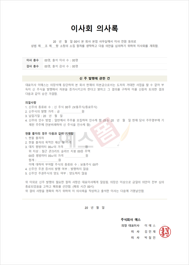 기업 이사회의 중요한 의사결정 사항을 공식적으로 기록하고 보관하고자 할 때 사용하는 예스폼 이사회 의사록(주식 증자) 양식입니다.