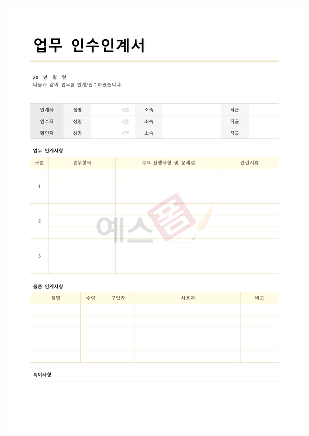 이에 예스폼에서는 업무 전달의 전반적인 내용을 포함한 업무 인수인계서 양식을 제공 중에 있는데요. 업무의 복잡성은 물론 중요성에 따라 상세한 내용을 담을 수 있고 간략한 내용 역시 담을 수 있는 양식이므로 만일 보다 자세한 업무 인수인계서를 작성하고자 하시는 분들이라면 예스폼에서 제공드리는 해당 양식을 활용해 보시기 바라겠습니다.