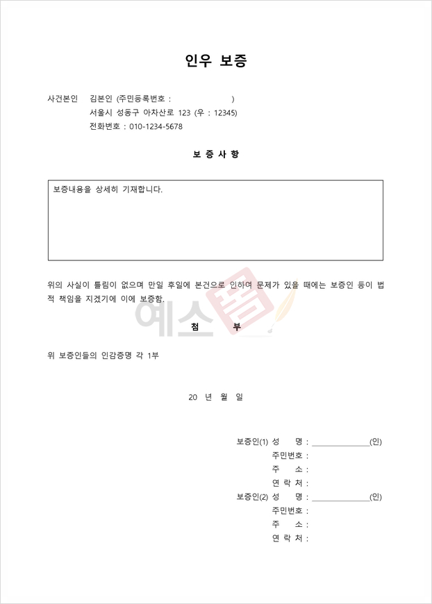 인우보증서 작성하는 방법 세 번째로는 보증받는 이의 인적 사항과 보증 내용이 작성되었다면 이를 보증하는 이의 성명과 주소, 주민등록번호와 같은 인적 사항 역시 기재해 보면 되는데요. 추가적으로 해당 보증인들의 경우 위 내용의 보증을 위해 인감증명이나 주민등록 등본을 첨부하는 것이 일반적이니 참고해 보시기 바라겠습니다.