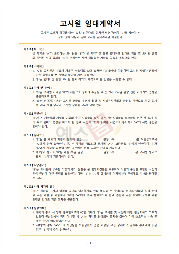 필수로 체크해야 하는 계약서 항목부터 실제 사용할 수 있는 임대계약서 양식을 소개드렸는데요. 소개드린 정수기 임대계약서, 창고 임대계약서, 표준임대계약서, 기계임대계약서, 공동주택 임대계약서, 고시원 임대계약서는 임대계약서 예시가 포함되어 있어 계약서 양식을 처음 접하시는 분도 예시를 토대로 손쉽게 규정을 수정, 변경할 수 있습니다. 임대 전 계약서를 꼼꼼하게 확인하는 것은 매우 중요하니 임대 기간, 임대료, 유지 보수, 해지 조건 등 중요한 계약서 항목들을 세심히 확인하시어 불필요한 분쟁이나 손실이 없길 바라겠습니다. 이 포스팅을 통해 여러분의 임대 계획이 무탈하게 지나가길 바랍니다. 서두르지 말고, 한 단계씩 차근차근 진행해 보세요.