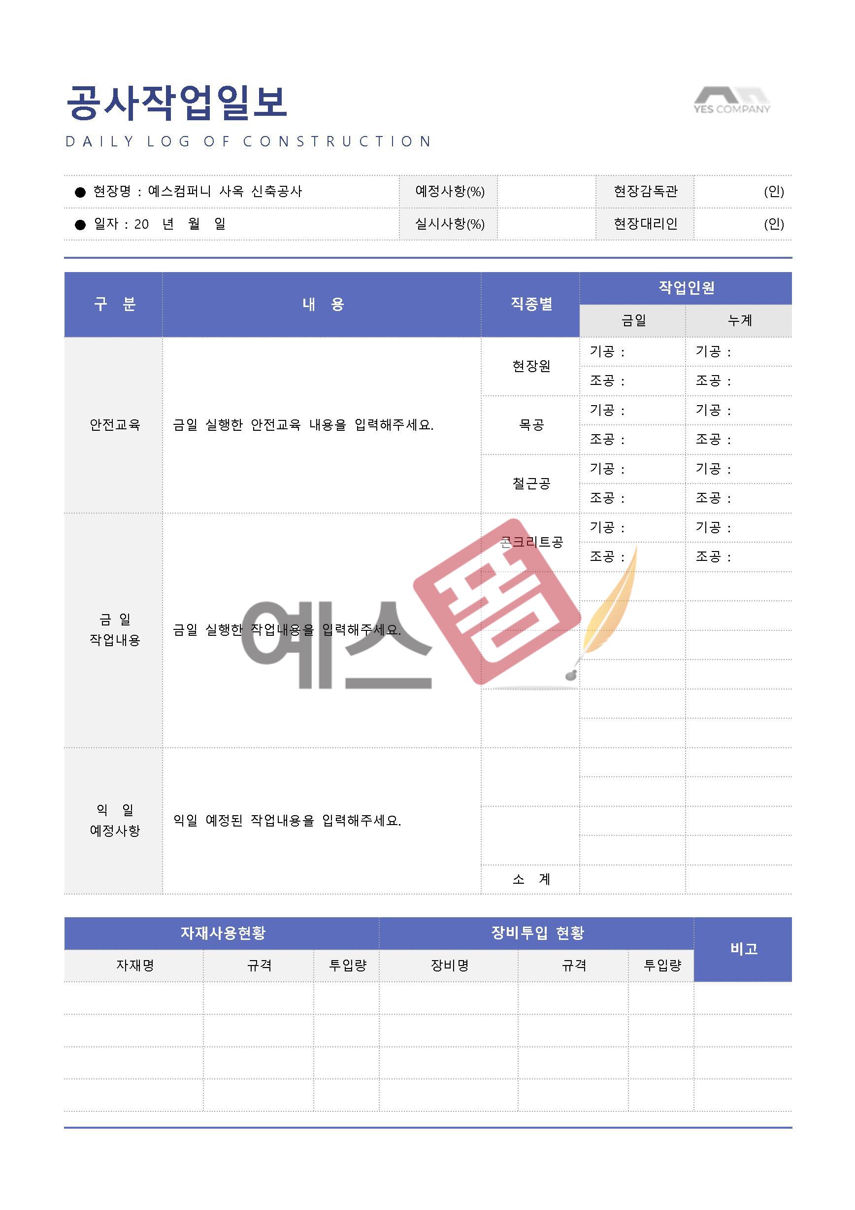 공사 작업 시 작업 진행 현황을 기록하기 위한 서식입니다. 작업 내용과 자재 사용 현황 및 장비 투입 현황 등 내용을 작성하는 공사 작업일보인데요. 공사현장에서 반드시 진행되어야 하는 안전교육 또한 직종별 작업 인원 별 모두 체크할 수 있으며 오늘 어떤 작업을 했는지, 내일은 어떤 작업을 진행할 계획인지 등 직종별로 모두 세분화하여 작성하실 수 있습니다.