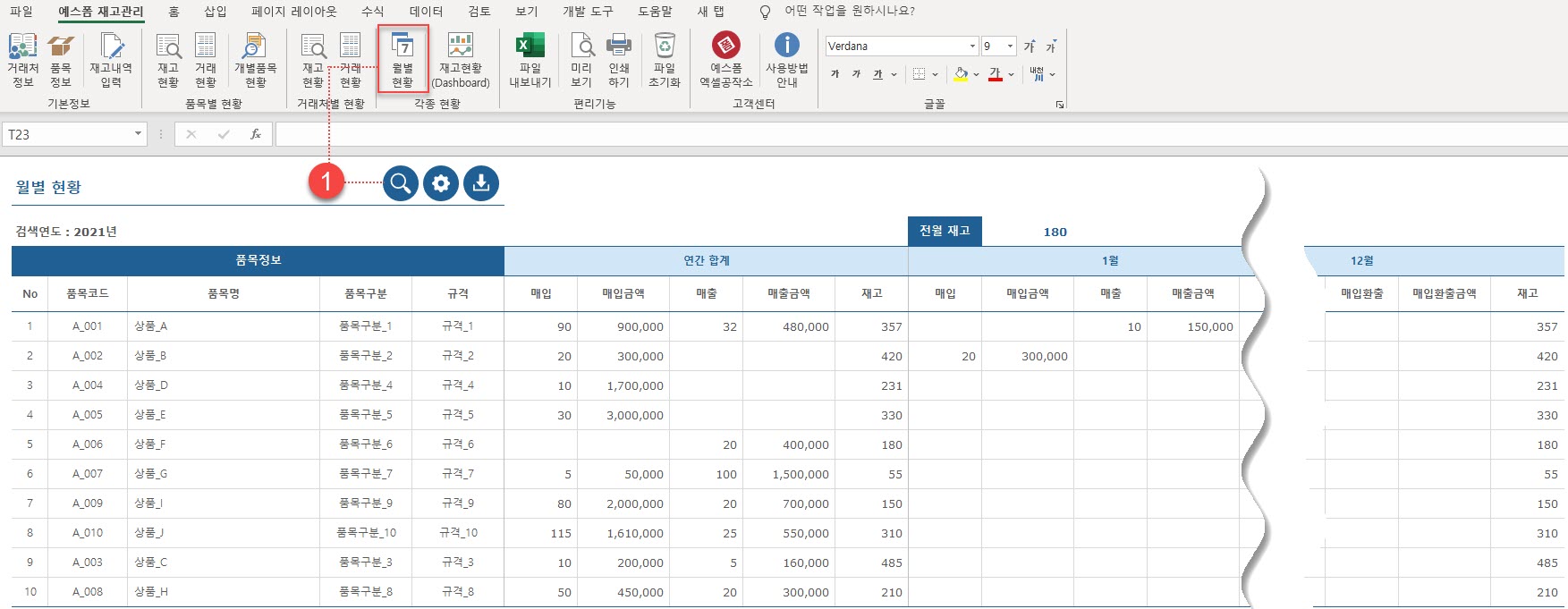 선택한 연도와 품목에 맞는 월별 재고현황(매입/매출/매출환입/매입환출/폐기)을 확인할 수 있습니다.