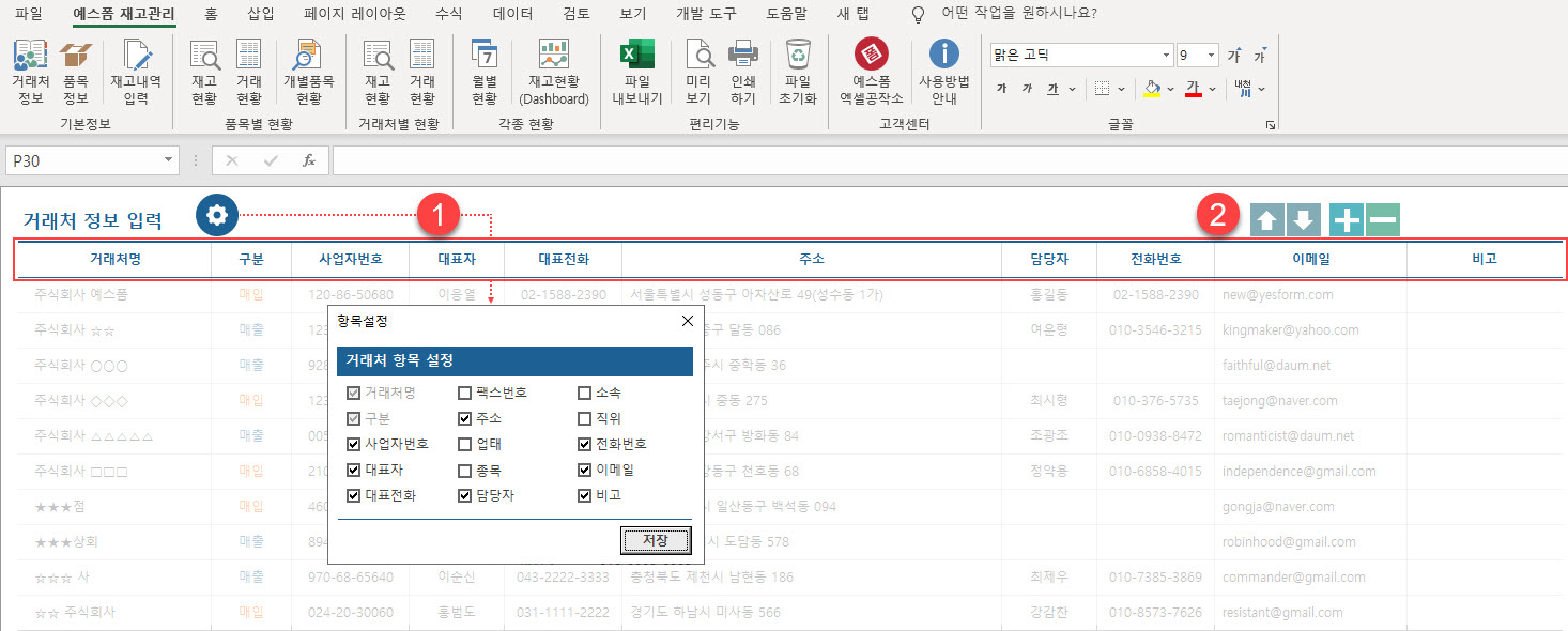 항목 설정 버튼을 클릭하여 원하는 거래처 항목만 선택하여 표시할 수 있습니다.