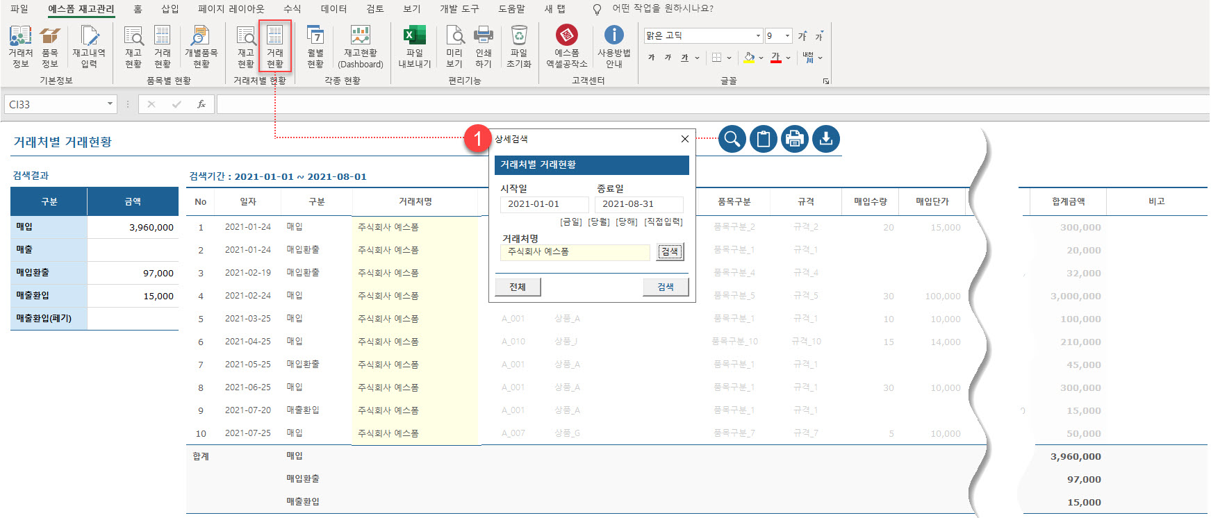 [거래현황] 버튼을 클릭하여 시작일, 종료일, 거래처명을 선택합니다. 전체 거래처 내역 검색도 가능합니다.