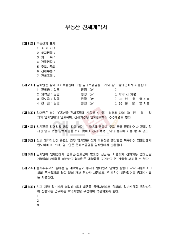 | 부동산 전세계약서 (중개업자를 두고 계약할 경우) |