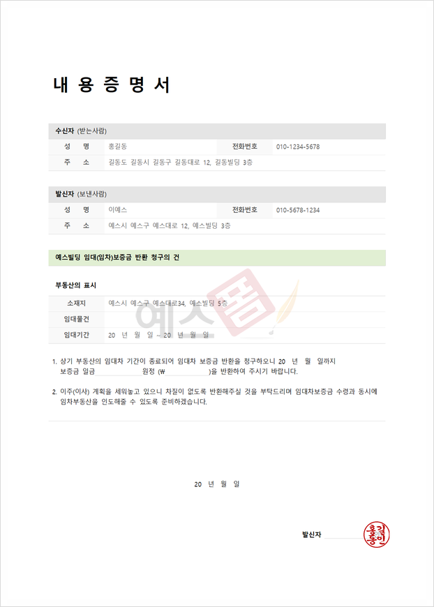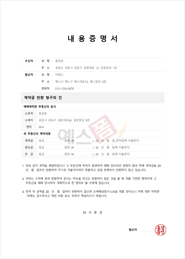 부동산 계약 체결 후 부동산에 하자가 발생하여 계약금의 반환을 해야하나 반환을 진행하지 않아 내용증명서를 보내는 양식입니다. 수신자와 발신자 및 증명내용을 기재하는 내용증명서(계약