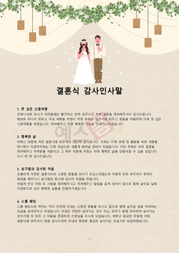 오늘은 예스폼에서 결혼식 대본, 결혼식 식순, 결혼식 축사, 결혼식 감사인사말에 대해서 알아보도록 하겠습니다.
