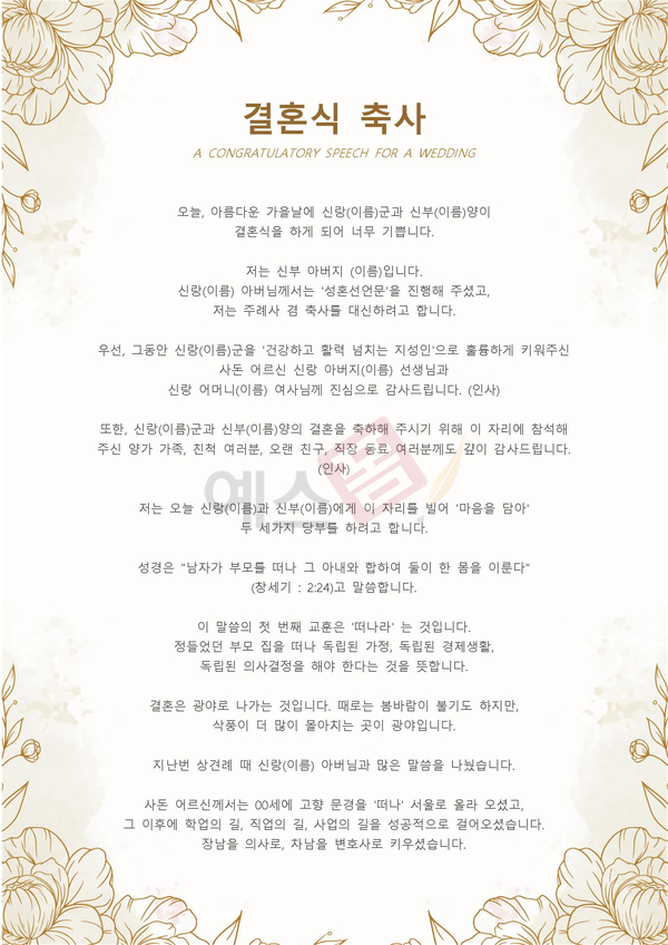 양가 부모님이나 형제자매, 은사님, 친한 친구 등 신랑, 신부와 친분이 있는 분들께서 두 사람의 앞날을 축복하는 내용의 축사를 부탁 받게 되었을 때, 예스폼의 결혼식 축사 예문을 참고하시어 작성해 보시기 바랍니다.