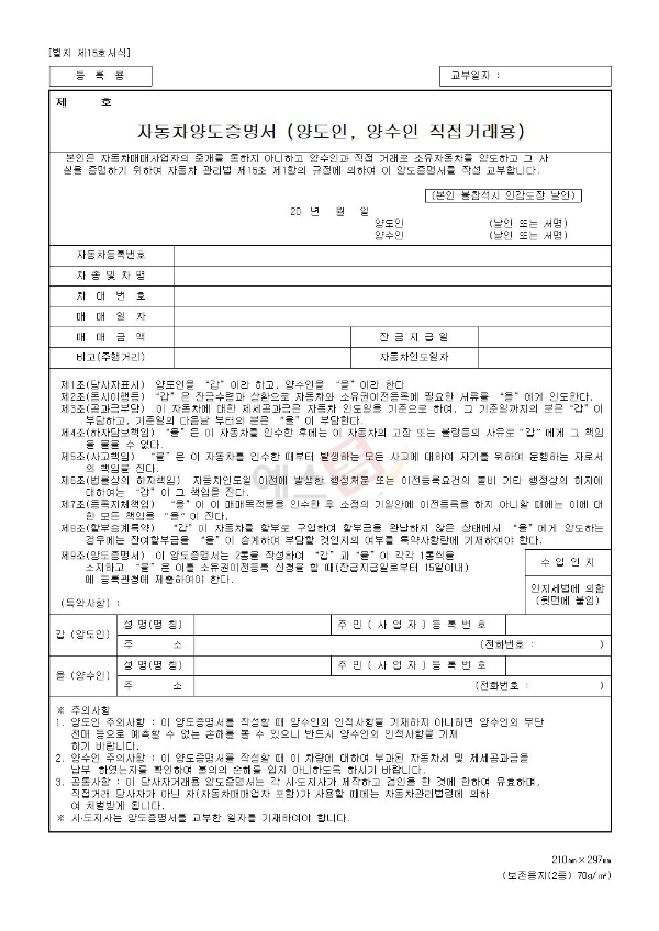 [별지 제xx호서식] 등 록 용 교부일자 : 제 호 자동차양도증명서 (양도인`` 양수인 직접거래용) 본인은 자동차매매사업자의 중개를 통하지 아니하고 양수인과 직접 거래로 소유자동차를 양도하고
