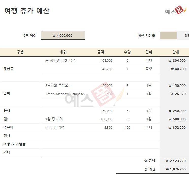 여행플래너 템플릿 구글 스프레드시트 - 예스폼 엑셀서식