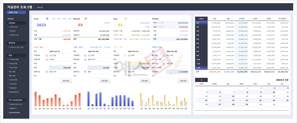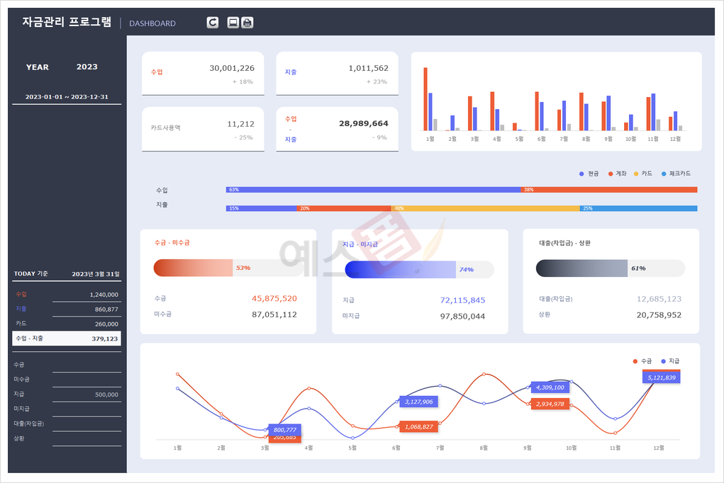 예스폼은 자금 관리 Program을 제공드리고 있는데요. 수입/지출, (미)수금/지급, 차입금(상환) 등의 회사 자금을 효율적으로 관리할 수 있도록 제작된 자금 관리 프로그램입니다. 거래처별∙자금별 현황, 차입금 현황, 월간∙월별∙연도별 현황, 거래처∙계정별 원장, 일계표(월계표) 등 다양한 형태의 검색 기능과 함께 연간 세무 달력이 자동으로 업데이트되는 기능을 제공합니다. 자금 일보(결산보고), 지출결의서가 자동으로 생성되는 기능을 제공하며 대시보드로 시각화된 데이터를 확인할 수 있습니다.