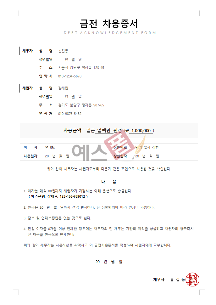 추천 양식: 연대보증인 포함 차용증