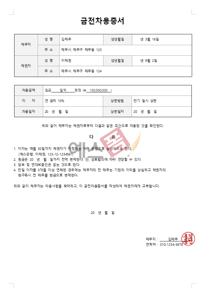 채무자가 채권자로부터 상기 금액을 차용했음을 확인하는 금전 차용증서 양식 및 예시입니다. 채무자와 채권자의 정보가 기재되어 있으며, 차용금액, 이자율, 상환방법, 차용일자, 상환일자 등