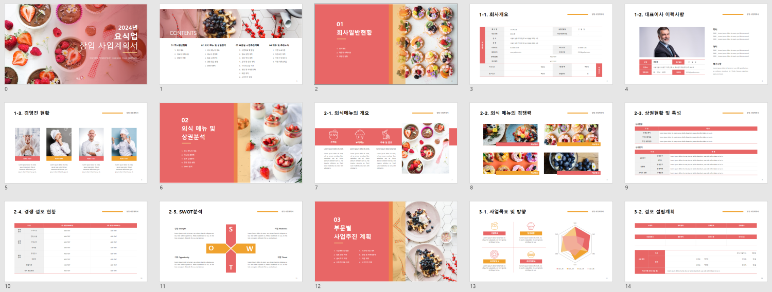 [2024년] 요식업 창업 사업계획서(디저트 전문점) 템플릿입니다. 디저트 전문점의 사랑스러움을 살려주는 핑크톤의 템플릿으로 창업을 위한 사업계획서로 투자제안이나, 자금조달에 관해서도 사용하실 수 있는데요. 다이어그램 세트 역시 통일감 있는 컬러로 구성하여 클릭 한 번에 원하는 컬러로 간편하게 커스터마이징을 할 수 있습니다.