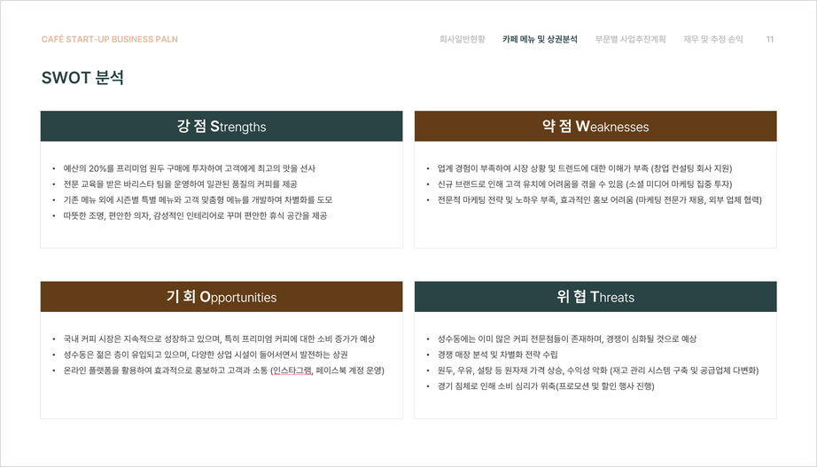 카페 메뉴 및 상권분석은 사업계획서의 핵심입니다. 먼저 카페 메뉴 개요와 메뉴 종류를 설명합니다. 카페의 대표 메뉴와 이를 뒷받침하는 다양한 메뉴를 소개하며, 이들이 어떻게 경쟁력을 갖추고 있는지 설명합니다. 이런 메뉴 경쟁력은 타 카페와의 차별화 요소가 될 수 있습니다. 다음으로 점포 상권분석을 통해 카페가 위치할 지역의 특성과 유동 인구를 파악합니다. 경쟁 점포 현황을 분석하여 경쟁 카페의 강점과 약점을 분석하고, 이를 바탕으로 SWOT 분석을 진행합니다. SWOT 분석을 통해 카페의 강점(Strengths), 약점(Weaknesses), 기회(Opportunities), 위협(Threats)을 체계적으로 정리하여 전략 수립에 큰 도움이 됩니다.