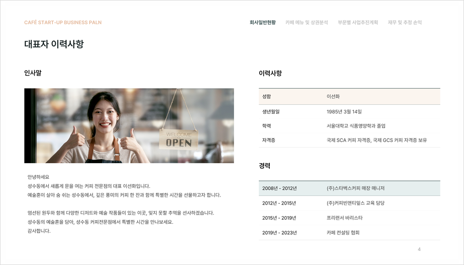 카페 창업계획서의 첫 번째 부분은 회사일반현황입니다. 여기에는 회사개요, 대표자 이력사항, 경영진 소개가 포함됩니다. 회사개요에서는 카페의 이름, 설립일, 위치, 사업 목적 등을 간략히 설명합니다. 대표자 이력사항은 창업자의 학력, 경력, 관련 자격증 등을 기술하여 신뢰성을 높입니다. 마지막으로 경영진 소개에서는 각 경영진의 역할과 그들의 경력, 전문성을 소개하여 팀의 역량을 강조합니다.