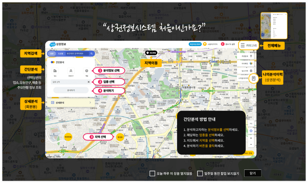 대한민국 공식 전자정부 누리집에서 제공하는 상권분석, 창업 진단, 교육 및 컨설팅 등의 기능을 제공합니다.