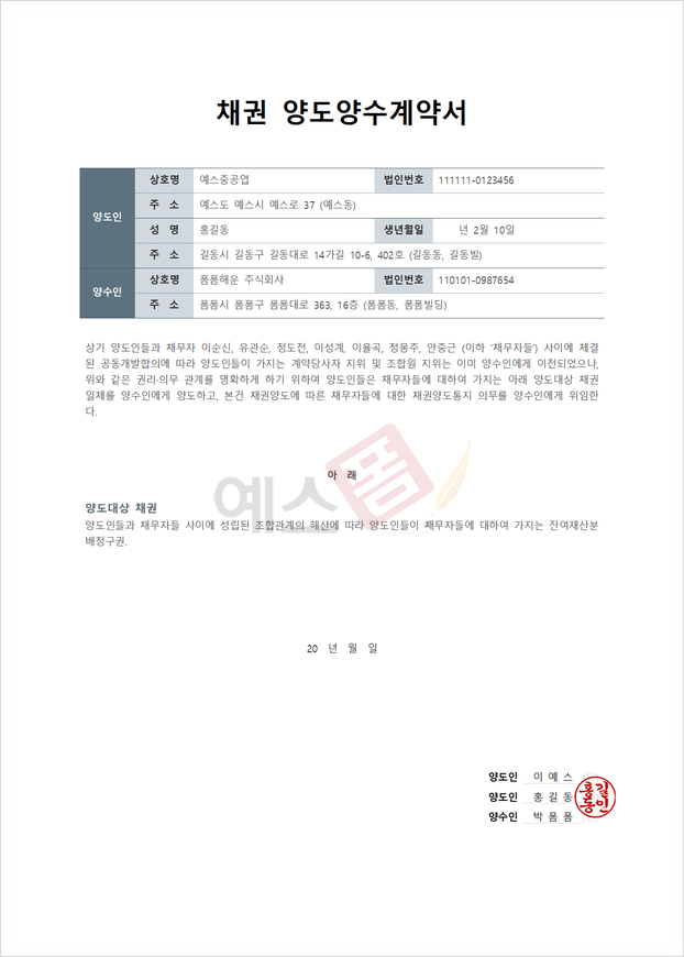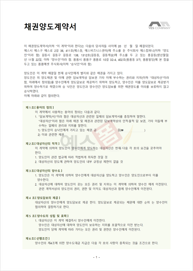 자산 양도계약서 (토지자산) | 채권양도계약서 (승낙인 포함) | 채권양도계약증서 |