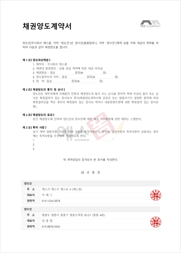 채권양도양수 계약서는 비즈니스나 개인 간의 거래에서 자주 사용되는 중요한 법적 문서입니다. 특히 채권을 다른 사람에게 양도하거나 양수할 때 이 계약서를 작성함으로써 법적 분쟁을 방지하고 명확한 권리 관계를 확립할 수 있죠. 하지만 채권양도양수 계약서에 대한 이해가 부족한 경우가 많은데요. 오늘은 채권양도양수 계약서의 기본 개념부터 채권양도양수 계약서 관련 자주 찾는 질문 그리고 계약서 작성 시 주의해야 할 점을 상세하게 설명드릴게요. 추가로 예스폼에서 업데이트된 채권양도양수 계약서 양식 및 예시 또한 소개드릴 예정이니 채권양도양수 계약서 양식 채권양도양수 계약서 예시를 찾으셨다면 꼭 참고해 보시기 바랍니다.