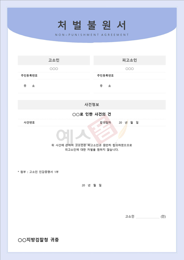 예스폼에는 오늘 함께 알아본 처벌불원서의 양식이 준비되어 있는데요. 예스폼의 처벌불원서는 지방검찰청에 처벌을 원하지 않는다는 내용을 작성하는 서식입니다. 또한 고소인 정보와 피고소인 정보 및 사건 정보 등의 내용들을 작성하는 처벌불원서 양식이라고 할 수 있습니다. 따라서 처벌불원서를 작성해야 하는 상황에서 유용하게 활용해보실 수 있을 것입니다.