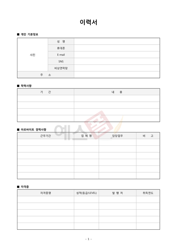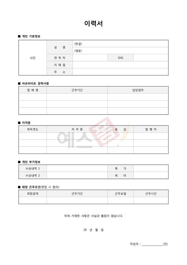 아르바이트 지원서 | 아르바이트 이력서 (일반형) | 아르바이트 이력서 (간단형) |