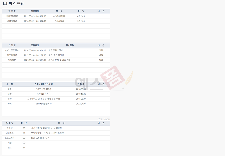 기본적인 이력서를 만들어 둘 수 있는 시트입니다. 지원 기업에 따라 양식이 달라질 수도 있지만, 이력서 내용은 대부분 비슷한 유형이므로 미리 작성해두시면 유용하게 활용하실 수 있습니다.