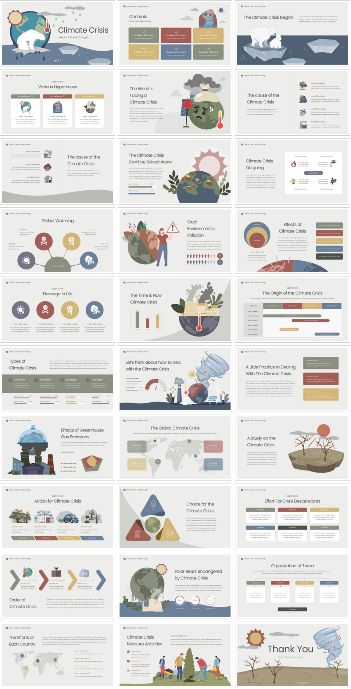 기후 변화와 위기를 주제로 제작된 30슬라이드의 템플릿입니다. 다양한 레이아웃과 일러스트를 사용하여 주제를 더욱 잘 전달해주고 있습니다.